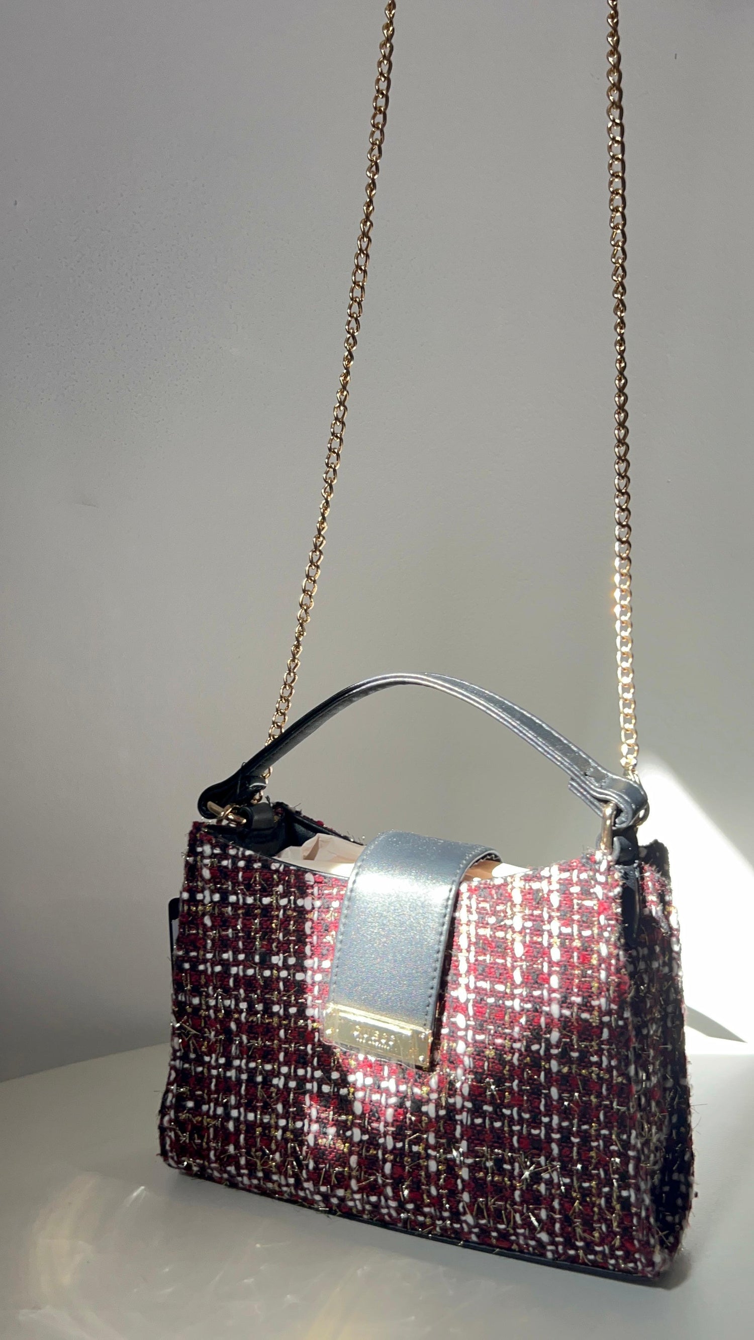 Diseño tipo satchel con una estructura redondeada y está confeccionado en un tejido tipo tweed con detalles en negro y herrajes dorados.